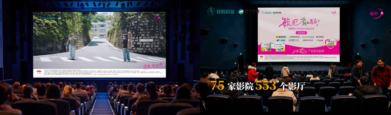 在线下场景的布局中,毓婷精准锁定年轻情侣的聚集地。全国7座核心城市、75家优质影院、553个影厅同步投放映前广告。在电影开场前的黄金时刻,以15秒暖心短片向观众送上一句“爱与被爱,都值得被守护”的贴心告白,让品牌的守护理念在沉浸式场景中快速传。